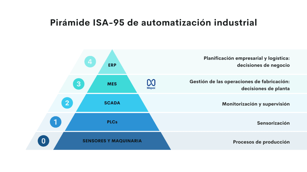 El MES (Manufacturing Execution System) ocupa un nivel intermedio entre el control de planta y la gestión empresarial. Su misión es gestionar, monitorizar y optimizar la ejecución de la producción.